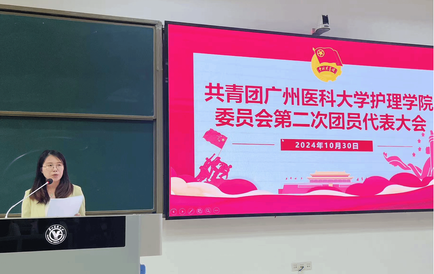党总支唐敏仪副书记,学生科欧丽娅主任、龙小花老师、张浩怡老师、温淼豪老师,科研科刘亚丹老师以及全院本科生和研究生团员代表参加了大会。会议由张浩怡老师主持。