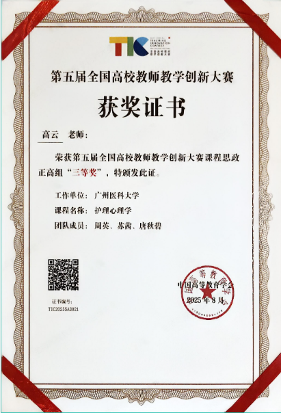 高云教授《护理心理学》课程团队,继省赛荣获特等奖后,代表广东赛区参加全国赛并取得佳绩,荣获全国高校教师教学创新大赛课程思政正高组“三等奖”。这也是银河