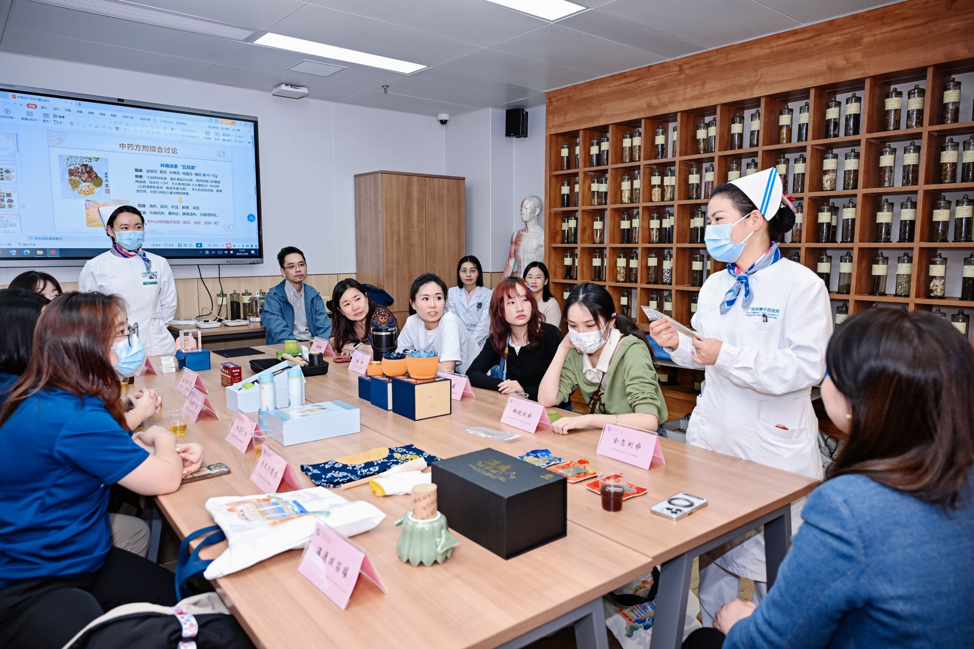 在学生交流环节中,两校学子围绕中西医结合护理模式与临床实践等议题展开了深入讨论。来访师生还参观了银河 医学模拟教育中心与科技展览馆等特色教学场所。在医学模拟教育中心,学生们亲身参与急症应急处置、精准护理操作等沉浸式模拟训练,在高度还原的临床场景中感受设备的仿真程度与科技含量;而在古色古香的中医馆内,则近距离观摩了艾灸、拔罐等中医外治技术,部分师生还主动体验了脉诊与药材辨识等项目,对中医药的辨证施治与实践应用表现出浓厚兴趣。