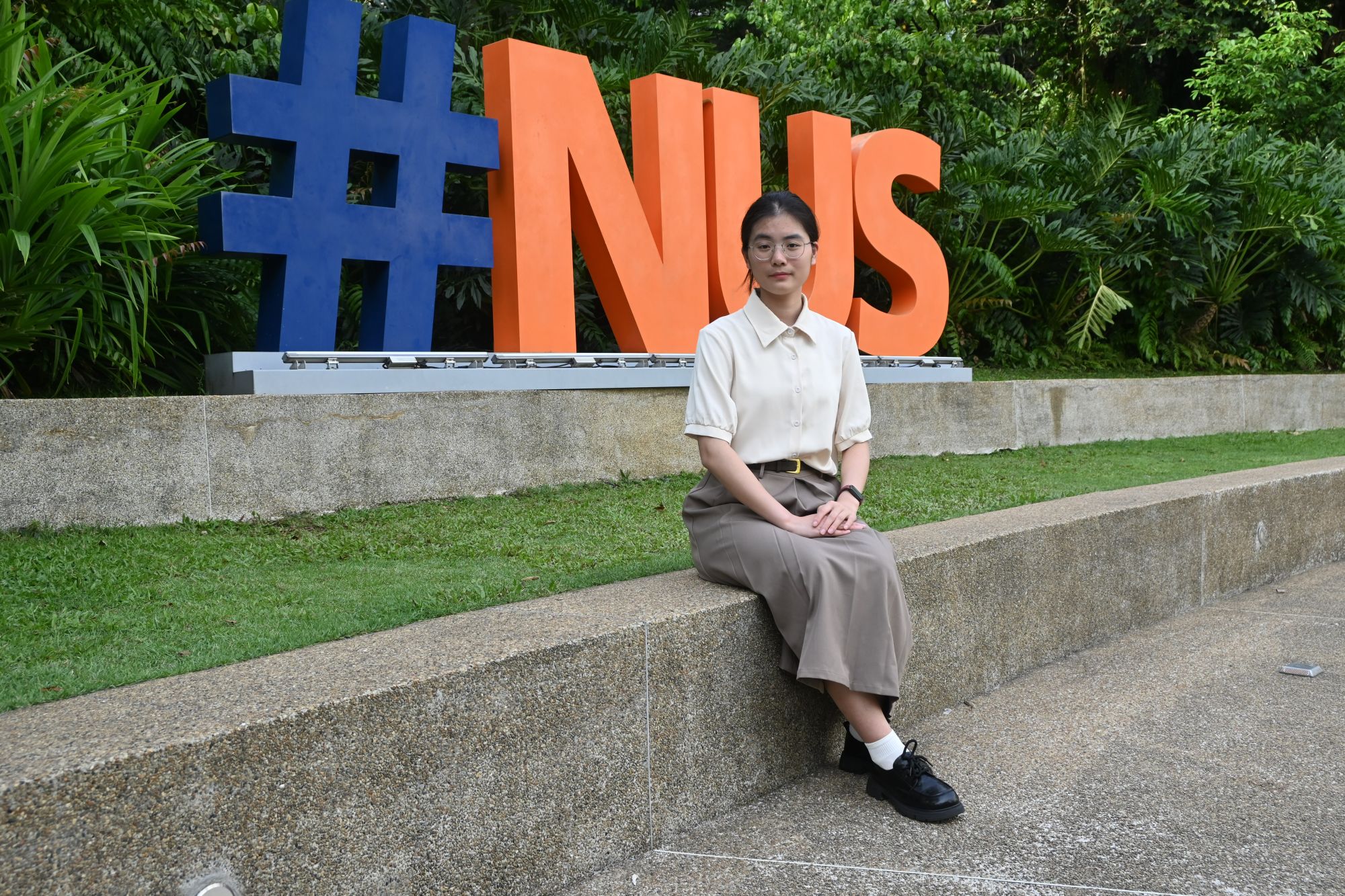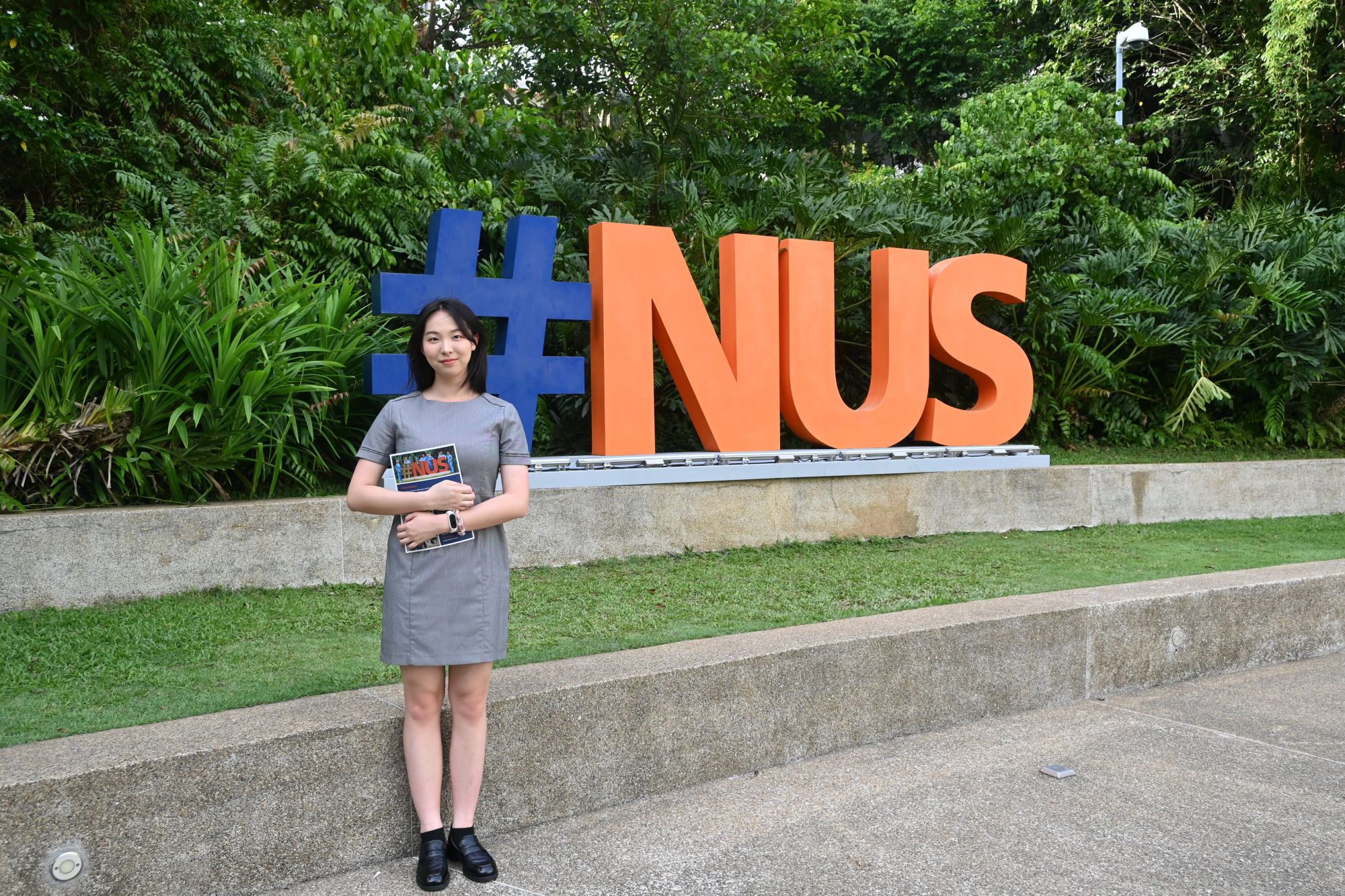 刘烨(左)、林敏晶(右)在NUS标志旁拍照留念