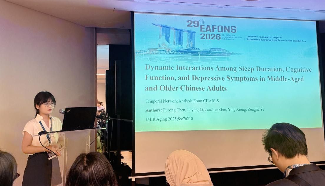 博士生陈付蓉进行了题为 “Dynamic Interactions Among Sleep Duration, Cognitive Function, and Depressive Symptoms in Middle-Aged and Older Chinese Adults: Temporal Network Analysis From CHARLS”的口头报告。该研究基于中国健康与养老追踪调查(CHARLS)纵向数据,对3136名45岁及以上中老年人群进行时序网络分析,揭示了睡眠时长、认知功能与抑郁症状之间的动态关系,为通过改善睡眠和情绪管理以缓解抑郁、延缓认知衰退提供了新的干预思路,受到与会国际学者广泛关注与高度评价。汇报结束后,多位国际学者与陈付蓉展开深入交流,围绕研究设计、数据分析方法等问题进行探讨。陈付蓉表示,这种面对面的学术对话让她获益良多,不仅获得了同行专家的宝贵建议,也为后续研究拓展了思路。