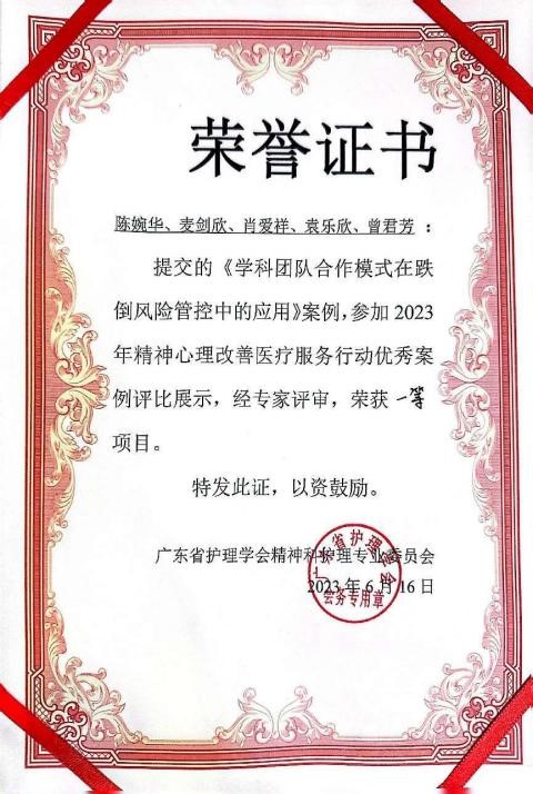 她善于运用PDCA循环、品管圈(QCC)、根本原因分析(RCA)等现代管理工具处理护理管理中的疑难复杂问题,并取得良好的效果。她主持多项质量改善项目获得“2022公立医院质量管理金鼎奖”(全国唯一精神专科医院获奖单位)、“2023年广东省精神心理改善医疗服务行动案例一等奖”“2020年医院首届品管圈(QCC)比赛获二等奖”。